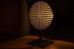 One Candle Mirror is a monumental installation situated in total darkness. The sculpture’s single light is diffused by 276 lenses positioned in front of the single candle. Each lens is articulated by a motor that rotates its focal direction “bending” the light to depict the viewer’s likeness while they move around the space. Rozin references the effect to that of a solar eclipse, citing the 1919 eclipse as a notable event that historically verified Albert Einstein’s theory of gravity bending light. Einstein’s theory was proven to be true by measures taken by Arthur Stanley Eddington during a total solar eclipse. In front of Rozin’s sculpture the viewer’s reflection is expressed as a silhouette made by the absence of light. In a nod to Keith Haring’s famously defined figures, Rozin plays with art historical archetypes through physical means.
